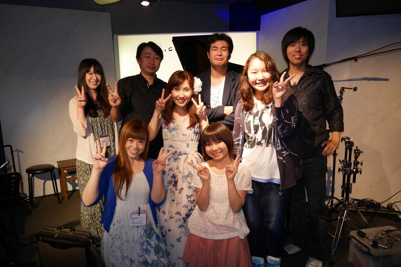 アルパ弾き語りで活動中のはとあちゃん、ピアノのTAK-YAMADAさん、ギターの佐土原武志さん、パーカションの吉田貴博さん、私のお隣がお荷物運ぶのを手伝ってくれた永田鈴華ちゃん、そして前の列左から総合スタッフをしてくれた羽鳥、その横がこれまたお荷物運ぶのを手伝ってくれた川瀬早紀ちゃんです。