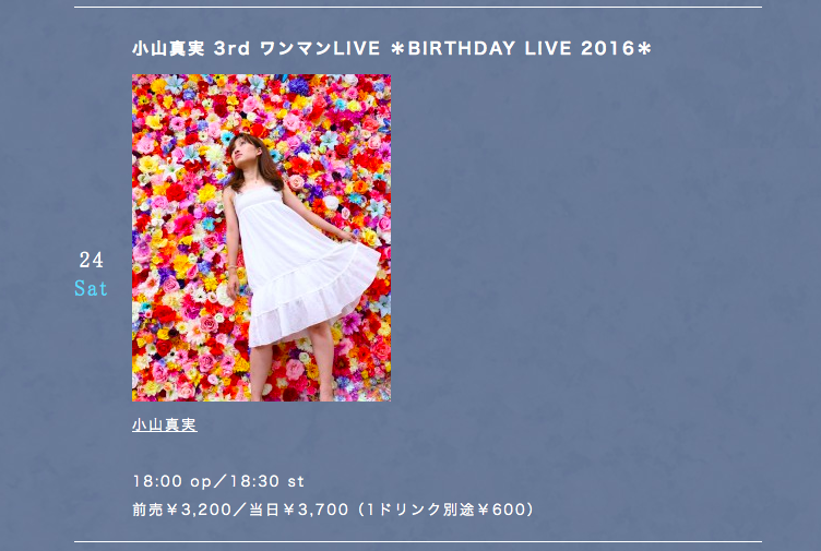 2016年9月24日 (土) 小山真実BIRTHDAY ワンマンLIVE2016 @四谷天窓.comfort 前売り3200円 当日3700円 D代なし
