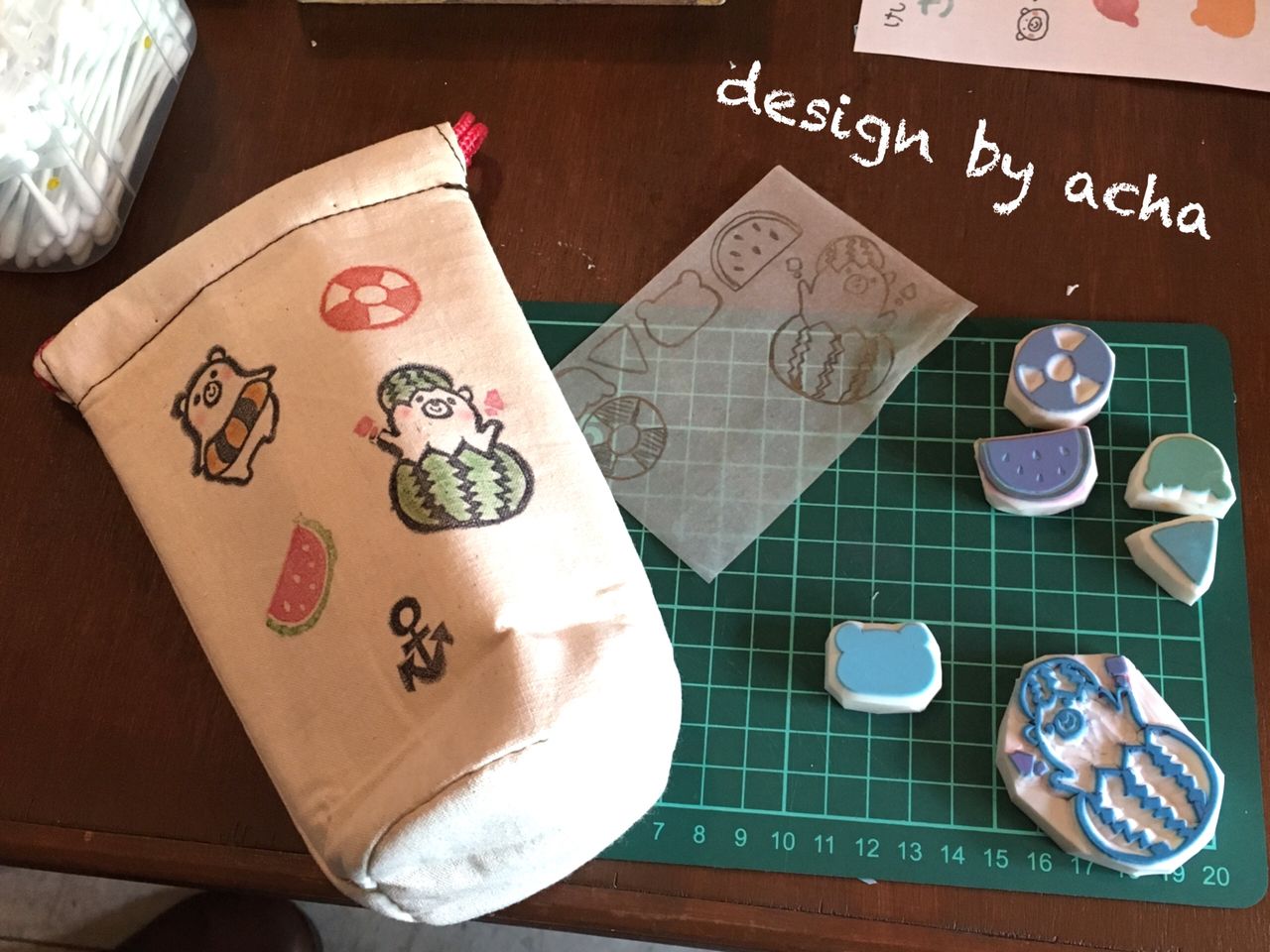ちなみに作品に押したはんこのうち、小山が作れたのはスイカから出てくるくまさん、浮き輪、すいかハンコ、くまさんの顔はんこの4種類で、カバーに押してある碇とうきわしている熊さんはachaさんの作品です