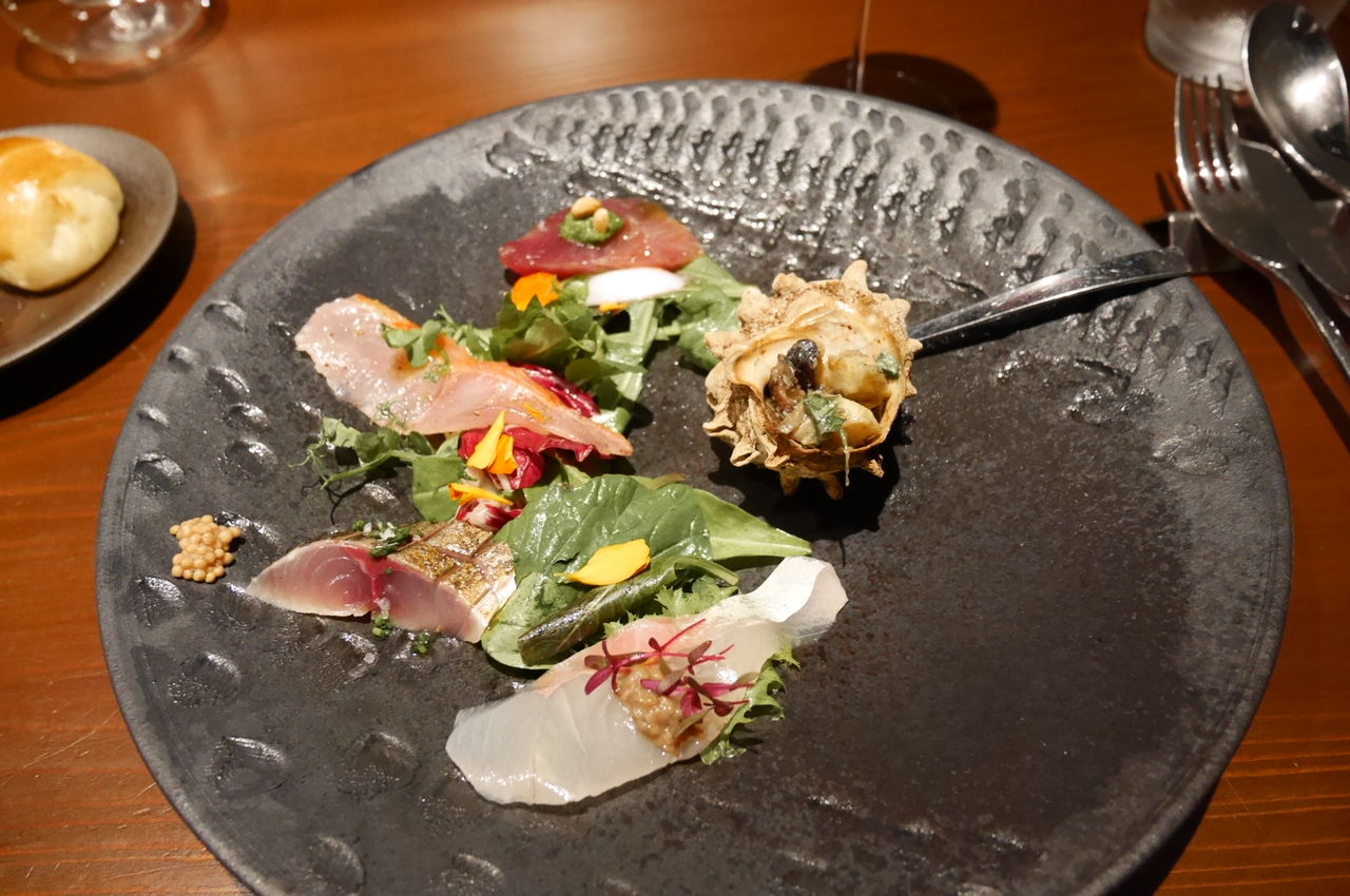 魚介にそれぞれ繊細なソースがかかったものと提携農家さんの新鮮お野菜♪