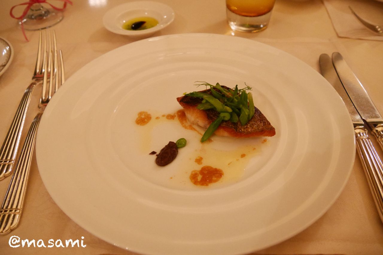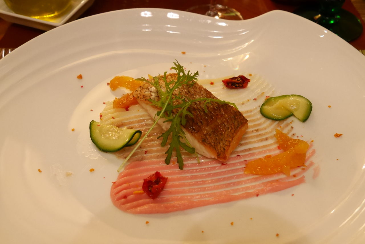 真鯛のポワレ セミドライトマトとアプリコットのコンディメンツ パルメザンクリームとタプナード