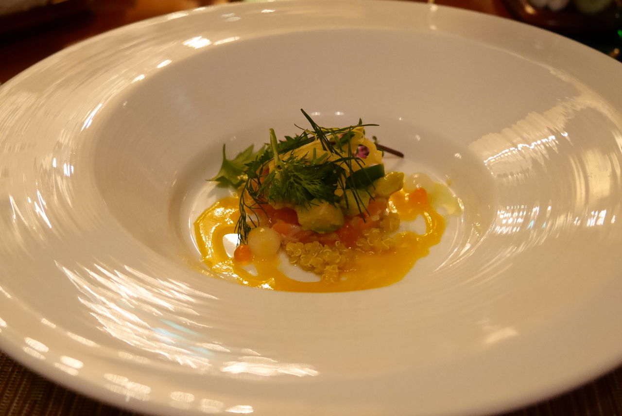 サーモンのタルタル マンゴーピュレとフヌイユのコンフィ キヌア・インゲン・アボカドのサラダ