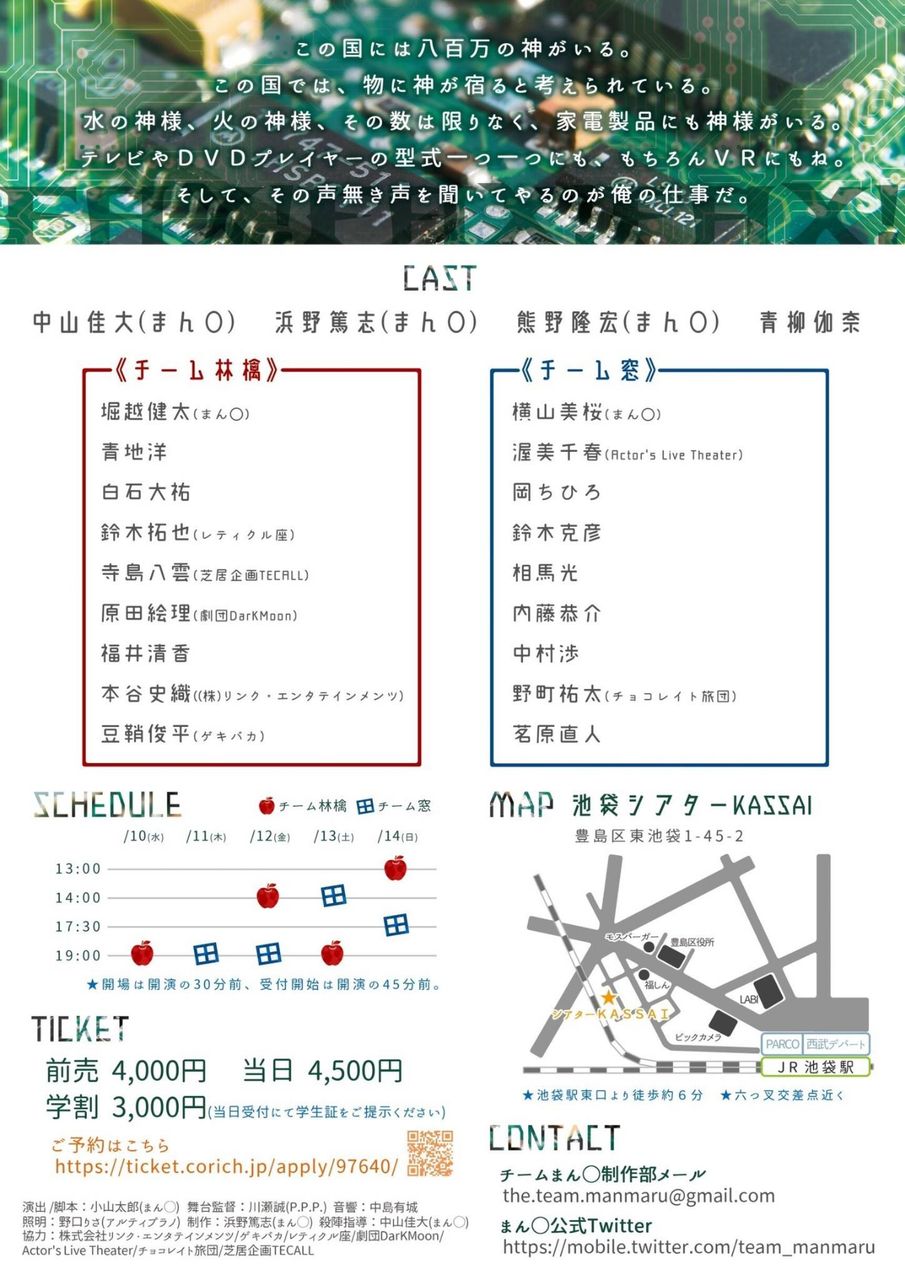 共演者も初めて出演させて頂いた『一万個』の時から御一緒しているまん◯メンバーの皆様に加えて、『春の花びら〜』以来となる相馬光さんや直近の『ごんべい』/『ごんべい2』でも大変お世話になりましたゲキバカの豆鞘俊平さん、更に他の舞台を観て以前から共演したいと思っていた役者さんもいらっしゃる豪華メンバー。