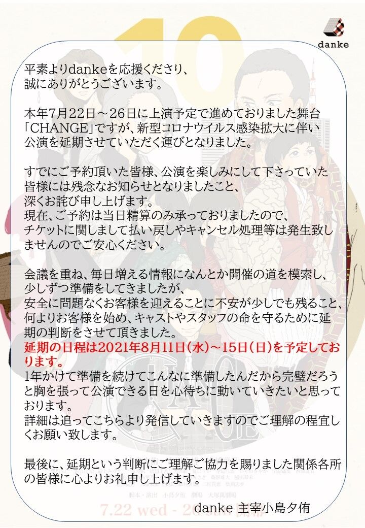 そして芝居と言えば、昨日7月に出演予定でした舞台『CHANGE』の公演延期発表がありました。