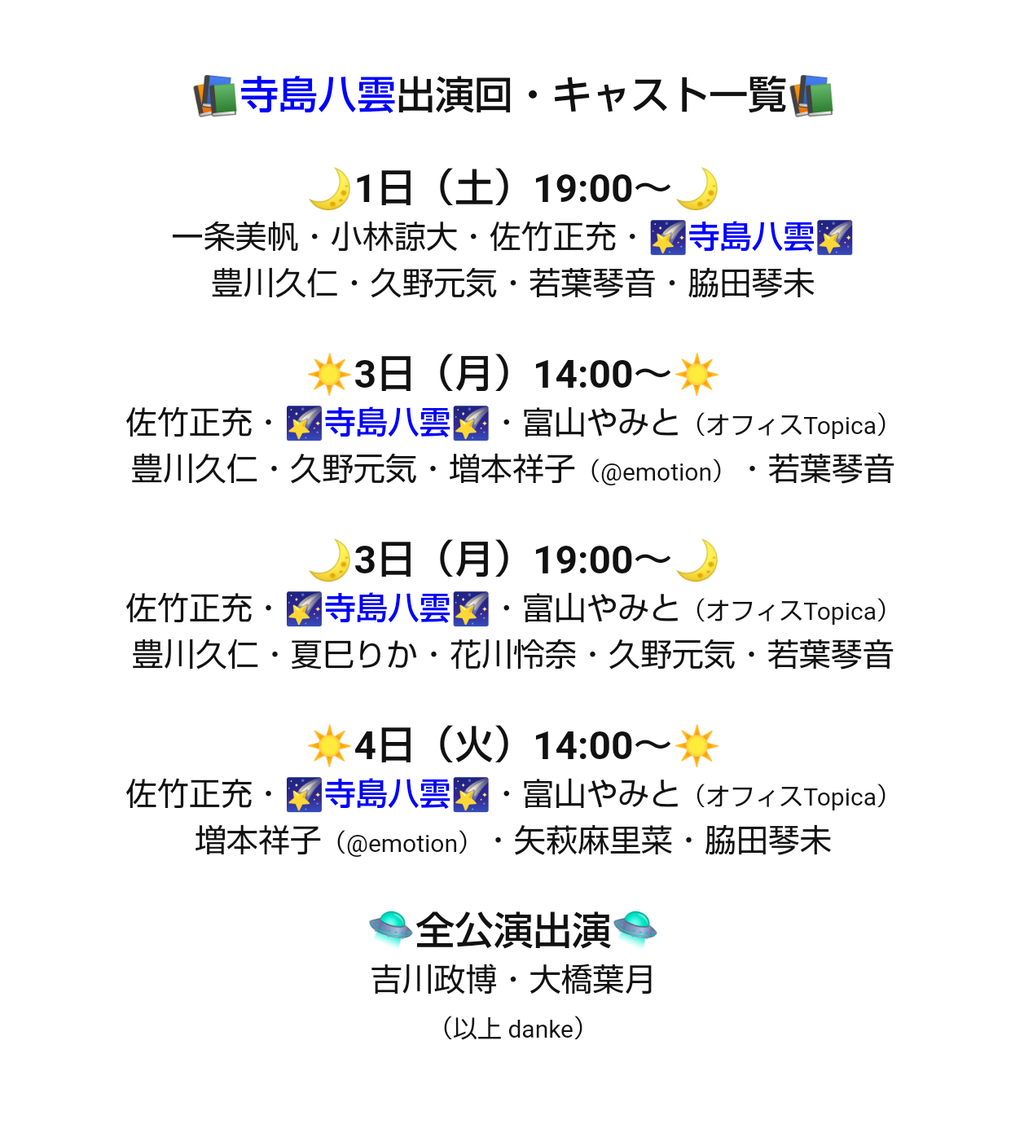 出演回の殆どが週明け平日ではありますが、瞬瞬必生なステージを是非、劇場でお味わい頂けたら幸いです。