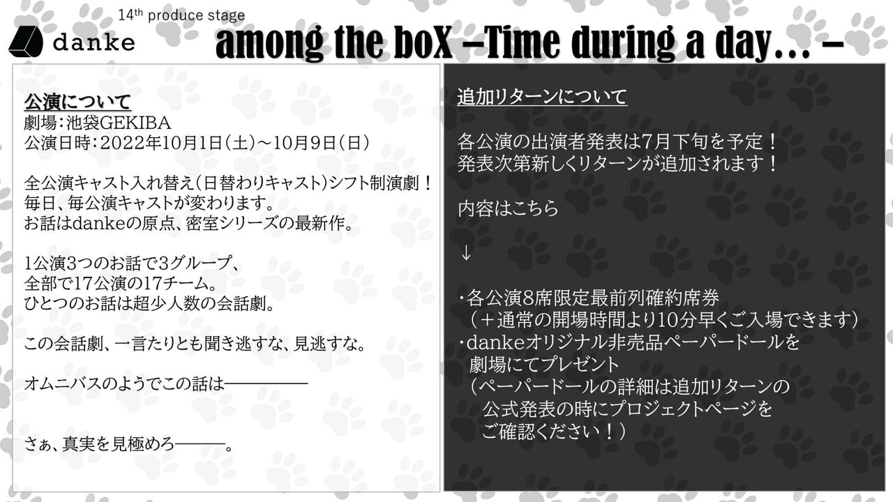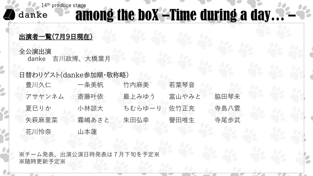 さて本日正午、10月出演のdanke『among the boX‐Time during a. day...‐』の出演日時が発表となりました。