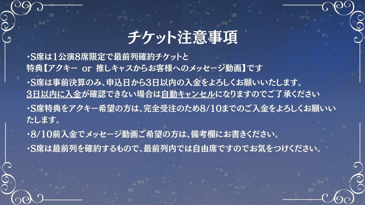 (削除) S席をご購入の方は8月10日(土)までの入金で【推しキャストのアクキー(全3種)】をプレゼント!