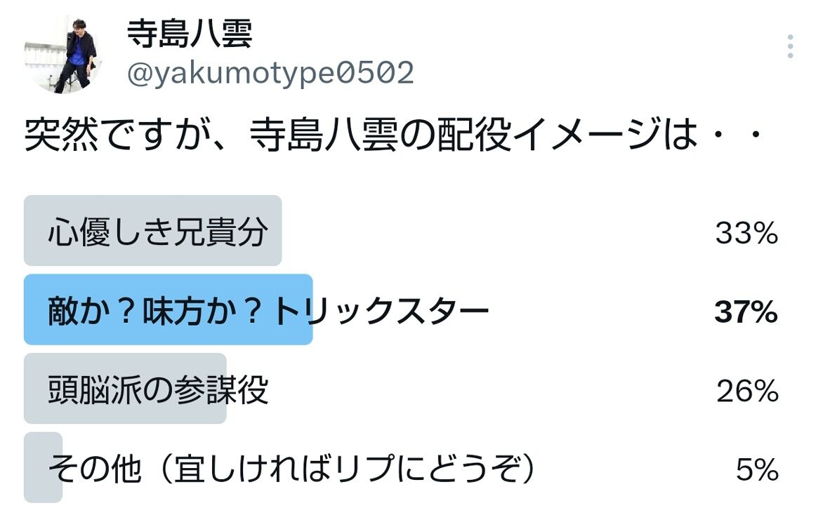 さて一昨日の夜に急遽思い付いて、X上に『寺島八雲の配役イメージ』に関する投票を投げてみました。