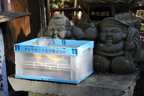 以前は中にあったザルを入口で受け取り、洞窟内で銭を洗う。