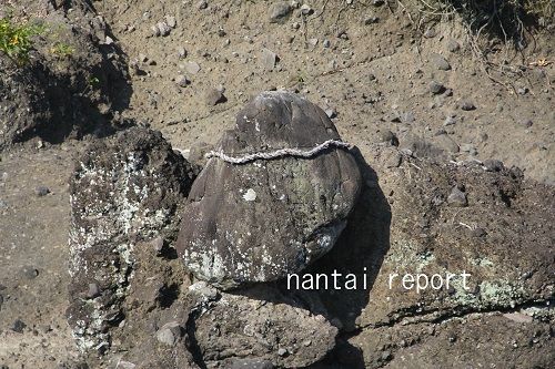 中州の岩にはワイヤーで固定された「しめ縄」があった。
