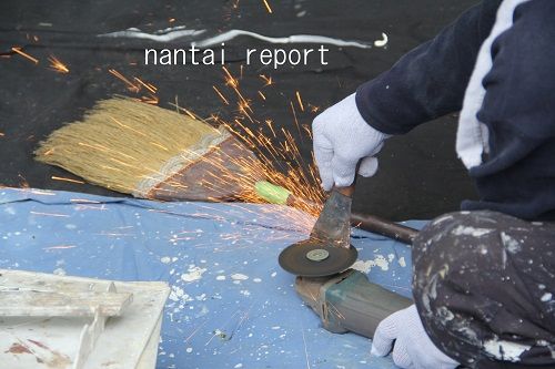 職人さんが、塗装剥がし作業の為のヘラの先端を研いでくれた。