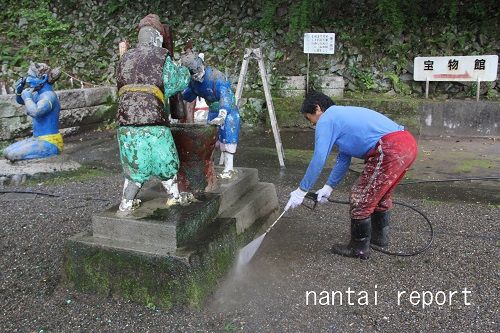まずは高圧洗浄機で修復する像を水洗い。