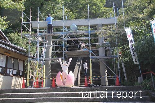 鳥居の修復は汚れを落としたり、ひび割れ部分を補強したりしている。