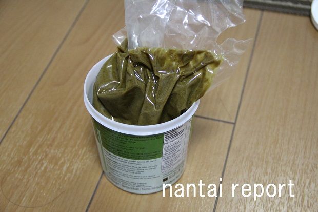 グリーンカレーペーストのフタを開けてビニールをカットするとこんな感じだ。