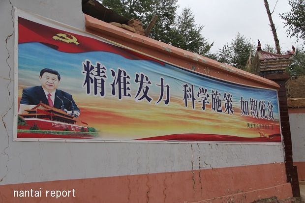 習近平の顔と貧困から脱しようというスローガンが貼られていた。