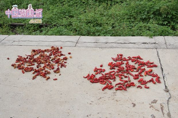 廃墟にしか見えない施設だが、管理人が居住しているのか唐辛子を干していた。