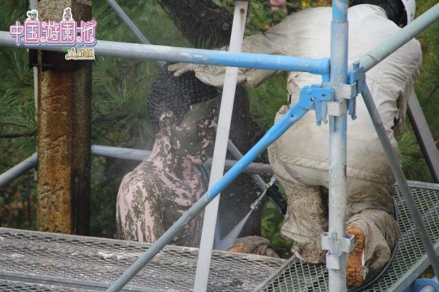 11月4日の早朝、日比野塗装店の職人さんが高圧洗浄機で水洗い。