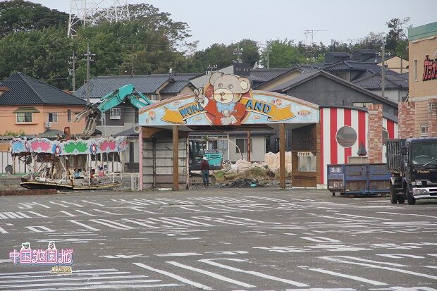 ワンダーランドのゲートにメリーゴーラウンド解体後の廃材を回収する