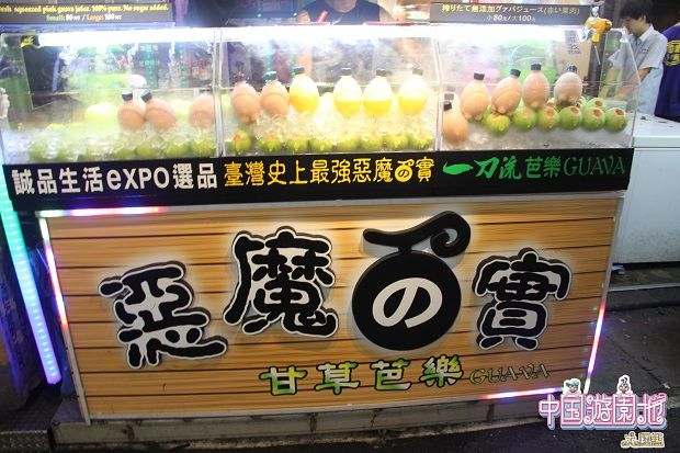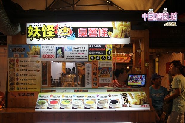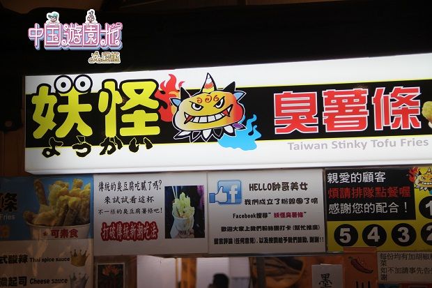 台北の饒河街夜市で見かけた「妖怪臭薯條」という屋号のお店。