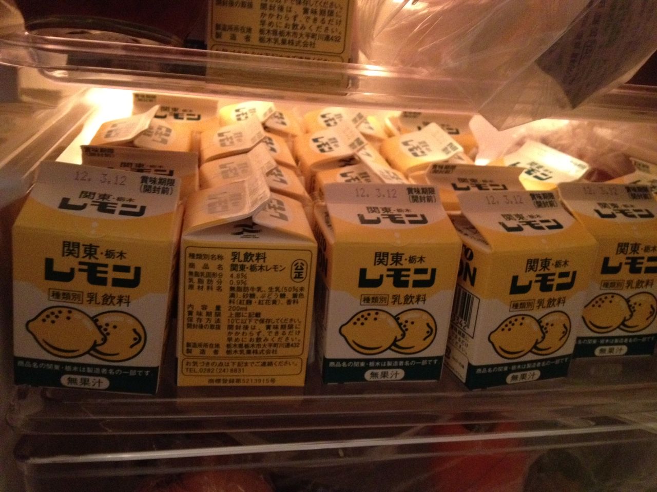 レモン牛乳たくさんの我が家の冷蔵庫内。これはワンマンのときのお土産です。