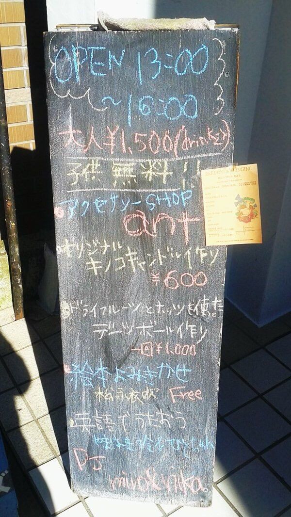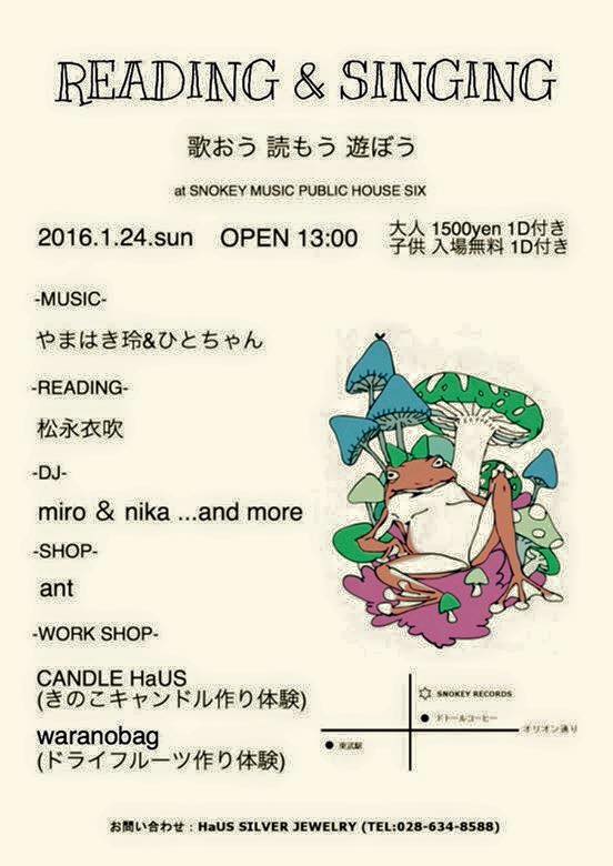世界が一瞬にしてかわってしまう絵本の読み聞かせ、ドライフルーツやナッツを使ったおかし作り(火は使いません。潰して丸めるという子どもが喜ぶような作り行程。もちろん大人にもうれしい栄養と美容にうれしいおやつ)、キノコの形のキャンドル作り。小学生の兄妹によるDJはメロメロ。自分好みのピアスやネックレスが出来上がるアクセサリーantさんも出店。やまはきは、子どもたちと歌を歌おうと思っています。