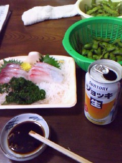 陽が沈む3時間も前には、枝豆&お刺身&ビールが食卓に...。