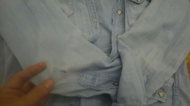 長年着たお気に入りのブリーチシャンブレーシャツ、気がつけば右肘部が破れてた〜!(泣)