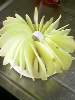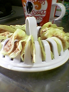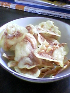 帰宅後さっそくポテトチップスに挑戦!この丸いのに野菜スライスを立てかけてチン!