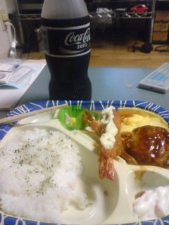 自分はご飯とコーラを難なく共有することができます。ごはん→ハンバーグ→コーラの三角食べを見事に体現しています。
