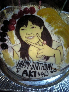 b1d0cbd7.jpgこの前のライブは企画してくれたキラキラシスターズ一員あきちゃんのお誕生日でもありました。このバースデーケーキを見てびっくりとっても可愛いしとっても似てるーーー。大事に飾っておきたいとこだけど、やはり食べ物ですので早めと言う訳でいただいちゃいました。美味しかった★★★☆★これからもより女に磨きをかけていってね。本当におめでとう(アッコ)