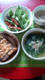 ライ麦パンチーズのせ。ほうれん草とベーコンのスープ、アスパラと人参のサラダ、豆乳チャイ。