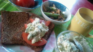 ライ麦パンにアボカドとささみのディップのせ。アスパラときのこのソテー。豆乳チャイ。