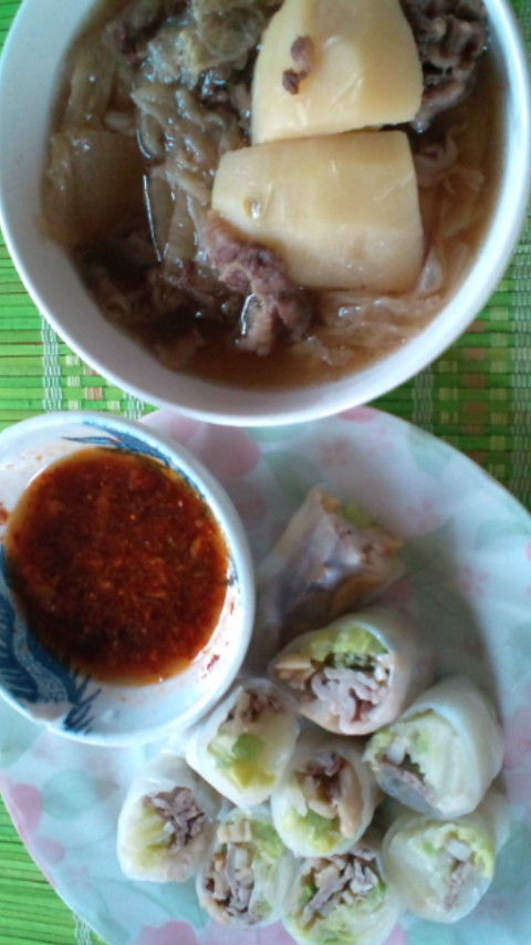 頂いた白菜がたくさんあるので、白菜とレンコンと牛肉の生春巻き。