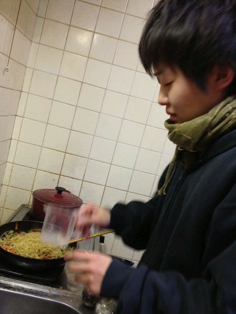 台所で飲みながら次の日の朝食とお弁当の準備。