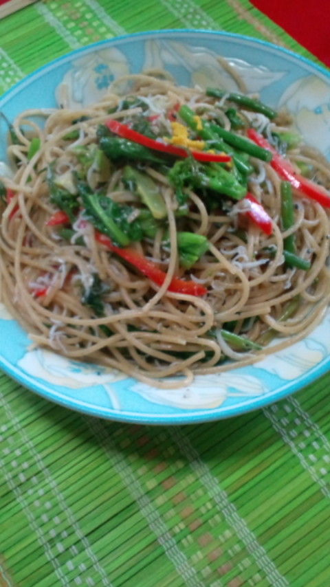 菜の花と芹とじゃこのぺペロンチーノ。タラの芽とかふきも食べたいな〜
