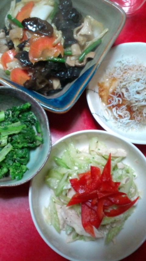 おつまみ4種。きくらげと豚肉の野菜炒め、菜の花の胡麻和え、セロリとささみのポン酢和え、しらすおろし。