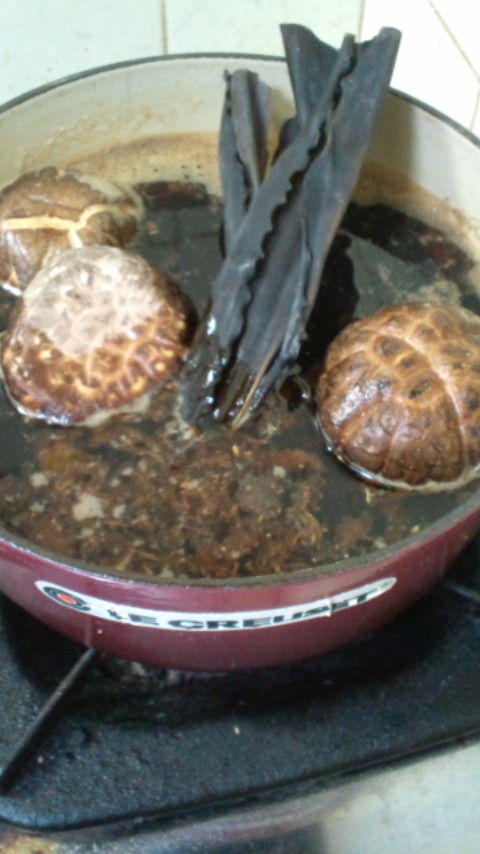 冷めてきたらこんぶと鰹節とどんこを入れます。
