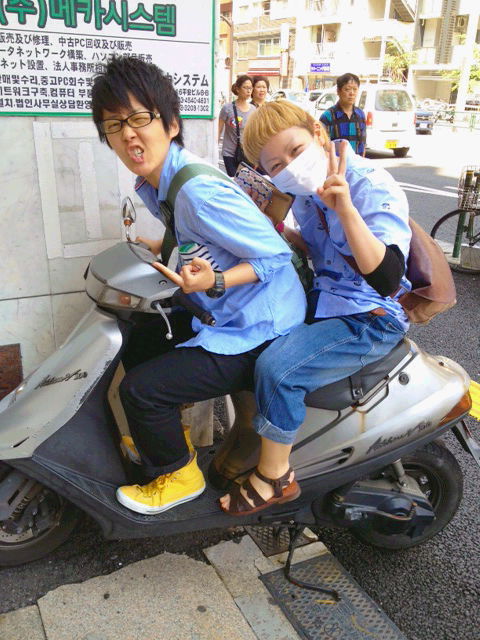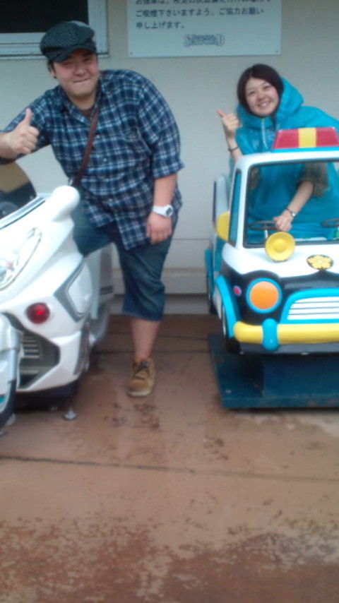 青空の下、おそろいの空色のシャツを着てこれからバイクに乗ってドライブだそう!