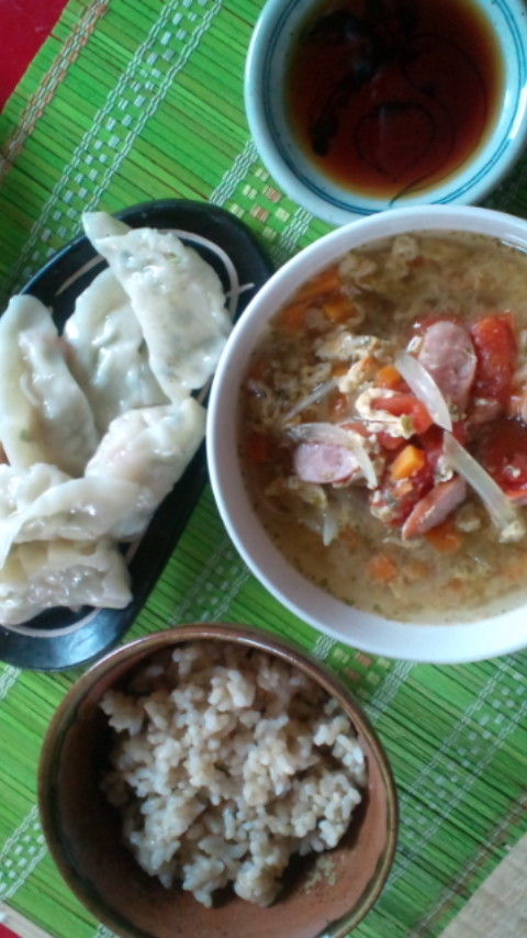 玄米、自家製コンソメのトマトスープ、手作り水餃子&自家製ポン酢。