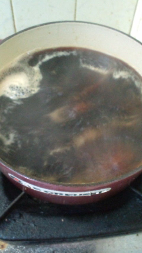 アルコールがとんだらしょうゆを入れて煮立たせます。