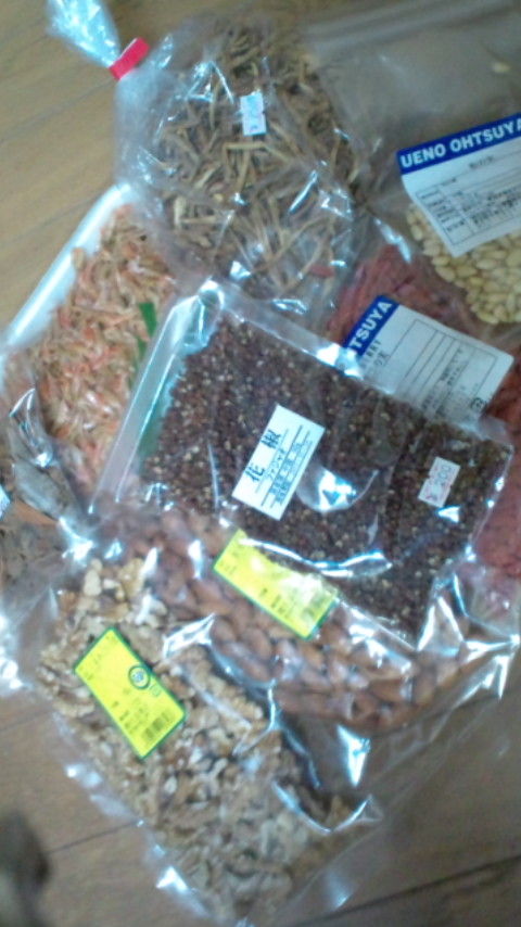 なつめ、くこの実、松の実、アーモンド&胡桃、桜エビ、鰹節、コンソメ、椎茸、混合にしただし、昆布、岩塩、唐辛子、花椒
