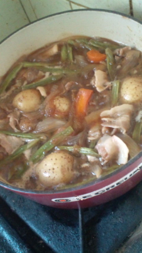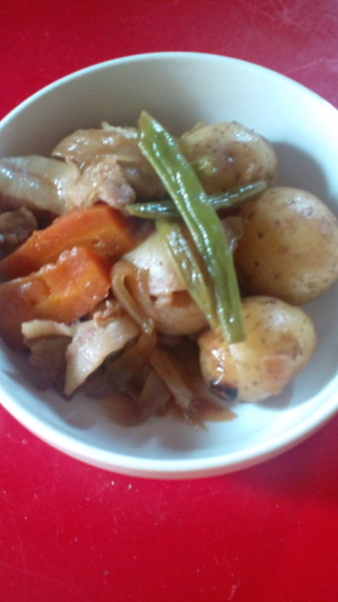 インゲンはしばらくいっしょに煮てしまって色が変わっちゃって失敗だったな。
