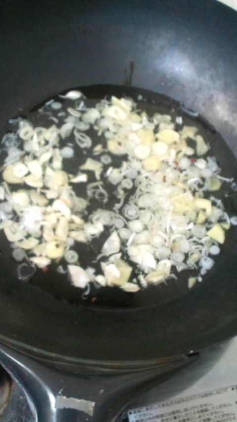 ねぎ、にんにく、しょうがをスライスしてサラダ油でゆっくり色が変わるまで揚げます。