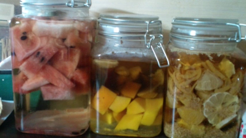 みかんは2カ月たったので材料をこして瓶に移してもう少し寝かします。