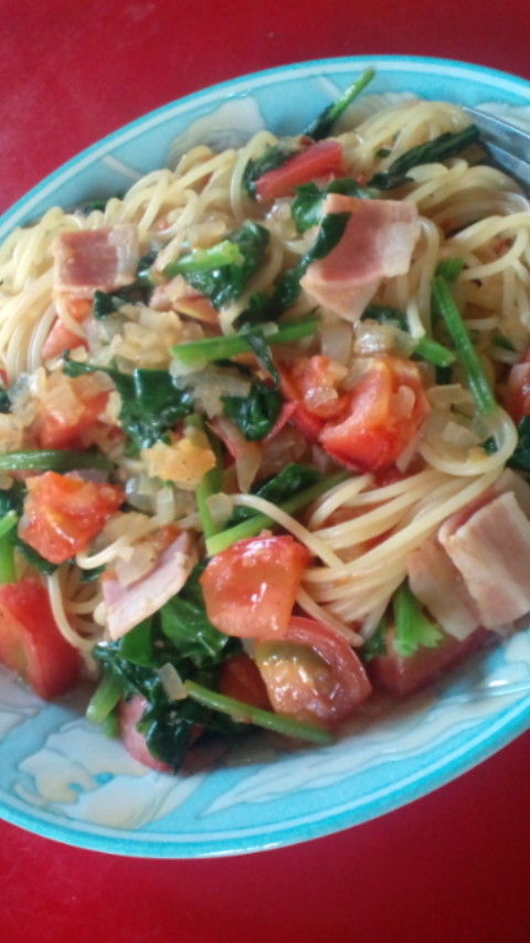 ベーコンとトマトとホウレンソウのぺペロンチーノ。
