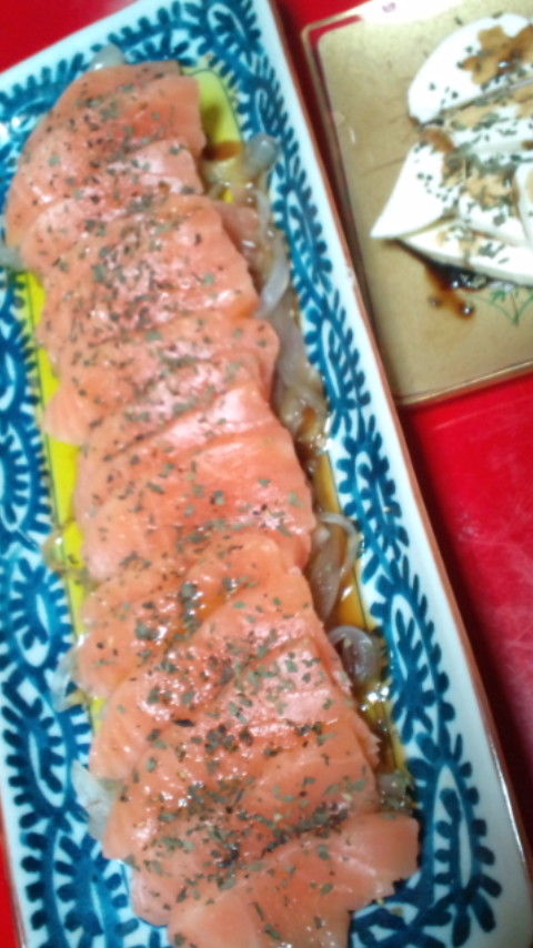 バルサミコ酢を少しふりかけてサーモンと玉ねぎといっしょにくるりと巻いて頂きます。