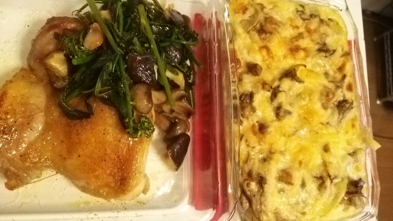 今日のお昼ごはんはローストチキンときのことシーチキンのグラタン(小麦粉はなし)