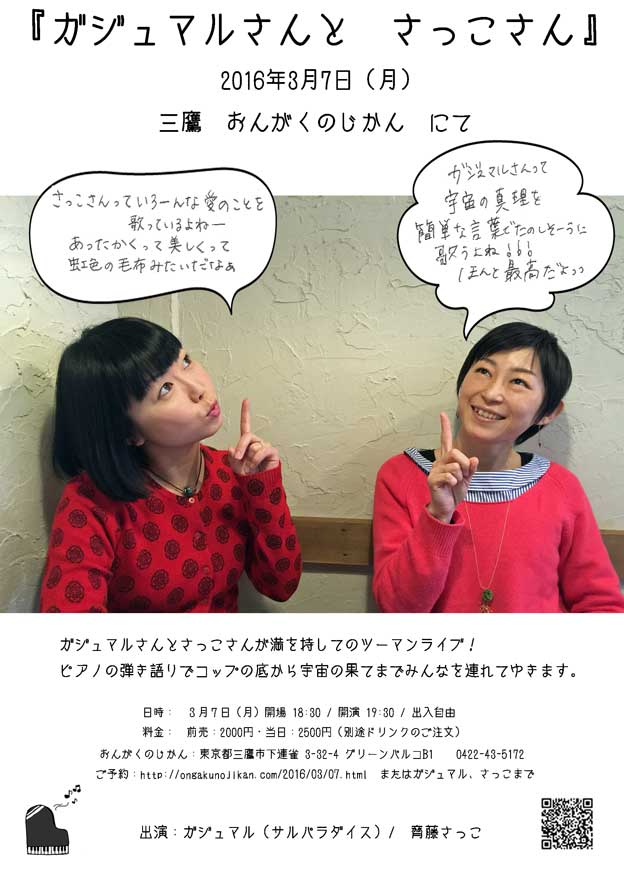 ご予約:http://ongakunojikan.com/2016/03/07.html またはガジュマル、さっこまで