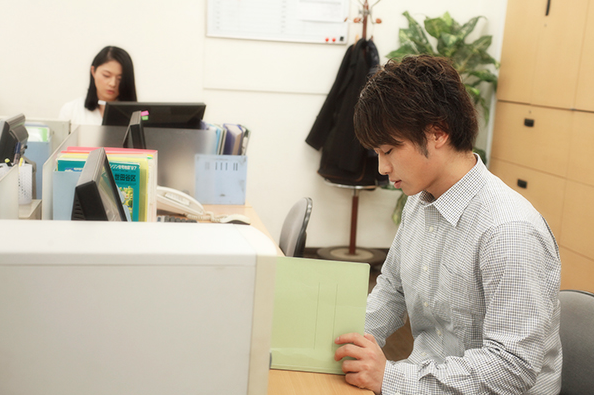 部下である峰島は少し抜けていて、上司の三田の手を焼いています...