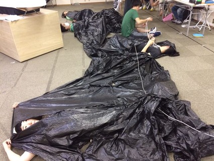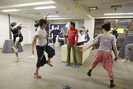 ストーリーもファンタジー要素が強いが、演出も単純ではなかった。舞台上には、人と人の繋がり(時にしがらみ)を表す紐が何本も張り巡らされている。また「闇」と呼ばれる120cm程の深さの穴が舞台上手にぽっかりと空いている。ハザマの衆はその中を踊ったり、変わったムーブメントをしたりしながらストーリーが進む。さらにクライマックスには長さ16mの黒ビニールの「闇」がみなを飲み込んだり、天井から伸びる長さ25mの布を棚引かせたり、舞台上をグライダーが飛んでいるように見せたりするのだが、それら仕掛けや小道具の操作はすべてキャストが自ら行う。毎公演滞りなく再現できるのか不安になる細かな段取り。私が小道具を取り忘れたら、或いは移動が間に合わなかったら、そのあとの展開が立ち行かなくなる。全員がその責任を果たさないと即座に崩壊する演出は恐ろしくもあった。